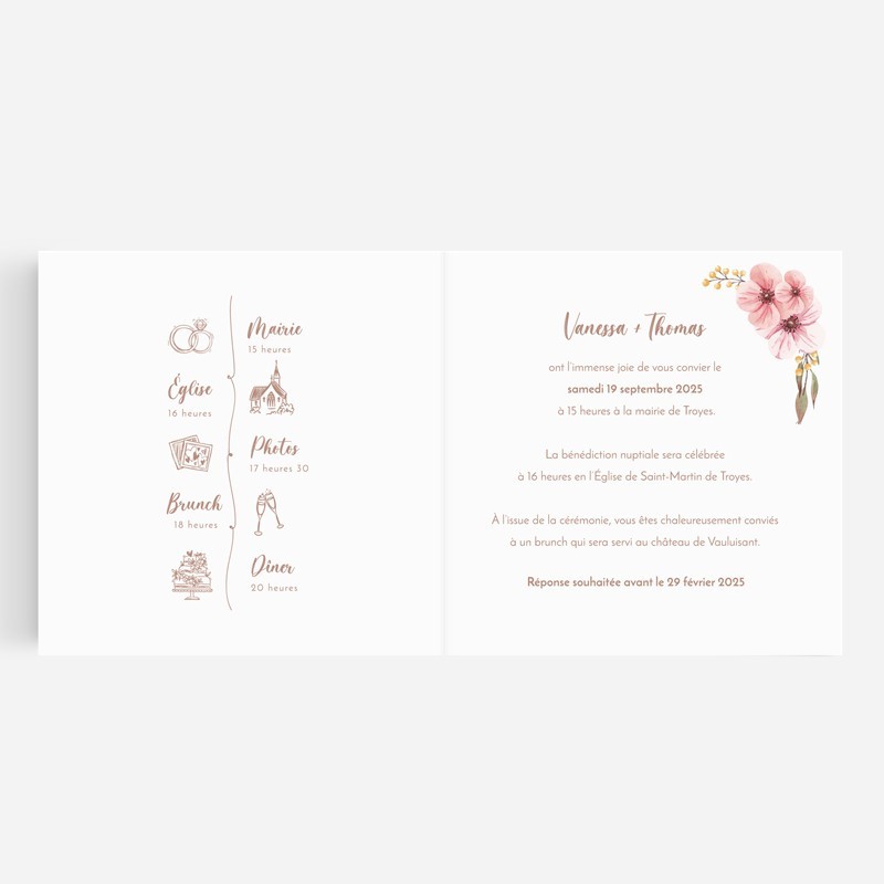 Nos modèles sont entièrement personnalisables, ce qui vous permet de créer une invitation qui vous ressemble. En choisissant un modèle romantique, vous êtes sûr(e) de créer un souvenir inoubliable de votre mariage, tout en partageant votre joie avec vos proches. Nos invitations élégantes et délicatement illustrées témoigneront de l'amour et de la beauté de votre union. Laissez-nous vous accompagner dans cette belle aventure et faire de votre mariage un jour unique et inoubliable.