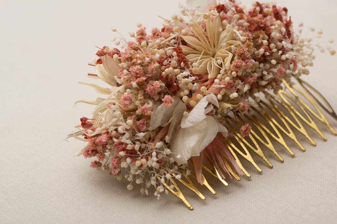 Le peigne à dent est un accessoire indispensable à avoir le jour de son mariage. Ce bijou de tête fantaisie pourra être porté sur tous types de coiffure de mariée : attachée et semi-attachée. Très tendance, un peigne arbore différents coloris pour rentrer dans le thème de chacun de vos mariages aussi uniques qu’ils soient. Que votre thème de mariage soit fleuri, ivoire, écru, doré, nacre ou encore bronze, tous les accessoires Les Couronnes de Victoire sont personnalisables à l’infini ! Ces accessoires remplacent voile, voilette, chapeaux et permettent un rendu sophistiqué. Même les demoiselles d honneur peuvent se permettre cette touche finale à la place d’une épingle à cheveux ou d’une couronne de fleurs. Sur ce modèle, ici on aime ces teintes de roses, ce peigne apporte une touche fleurie et bohème à votre coiffure. Grâce à son format, ce grand peigne vient se glisser au creux d’un chignon élégant ou flou ou bien dans une tresse pour une allure de mariée boho-chic.